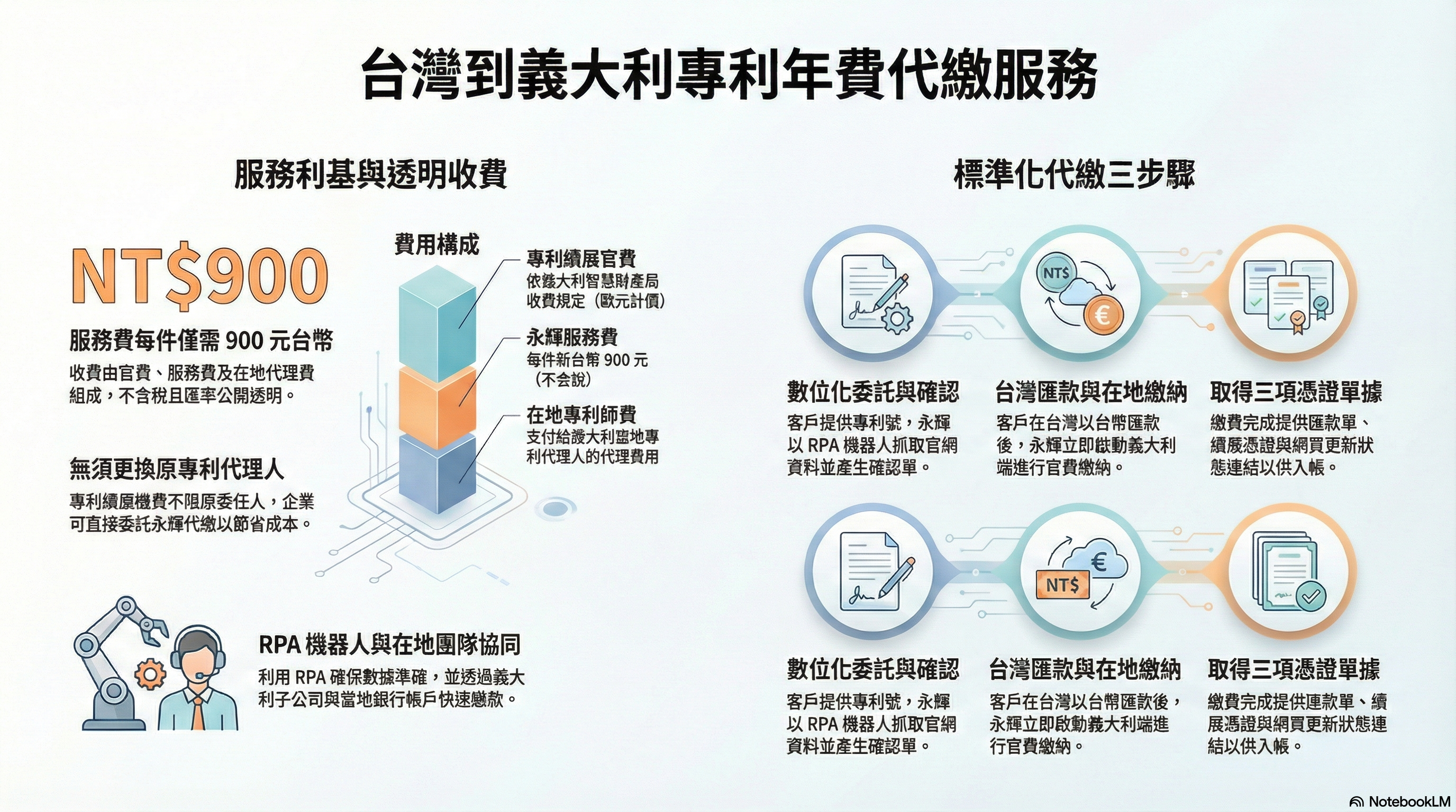 台灣企業或個人有義大利專利,永輝專利年費之代收代付服務流程為何?